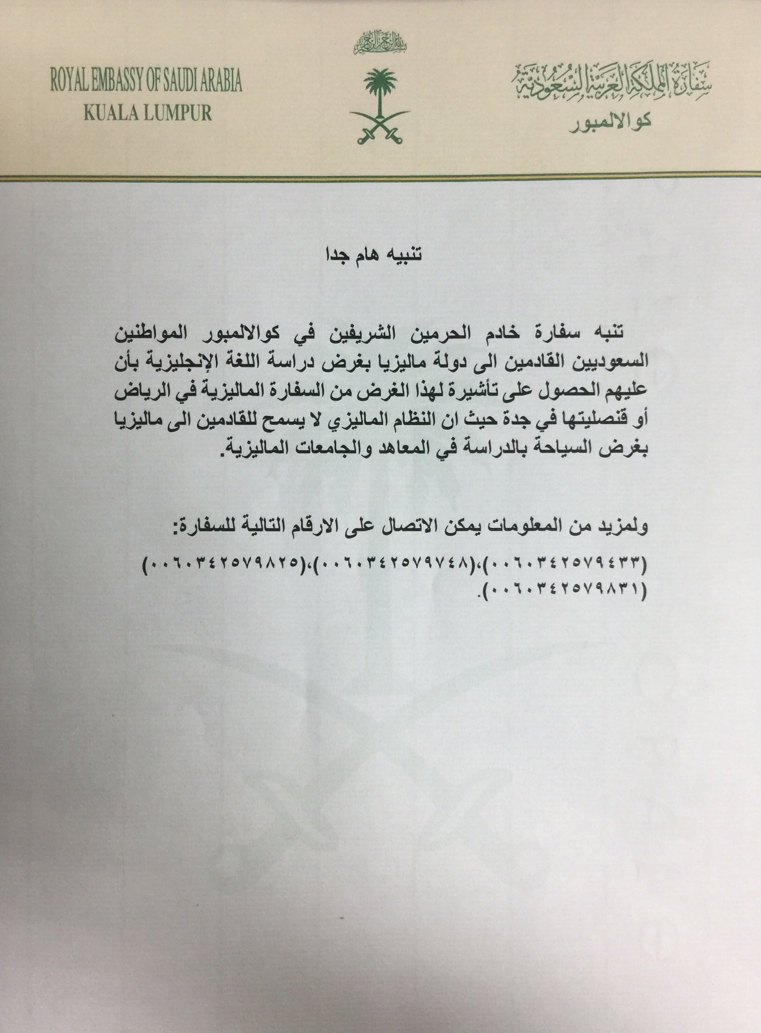 سفارة المملكة بماليزيا للراغبين بدارسة اللغة تلزمكم تأشيرة دراسية