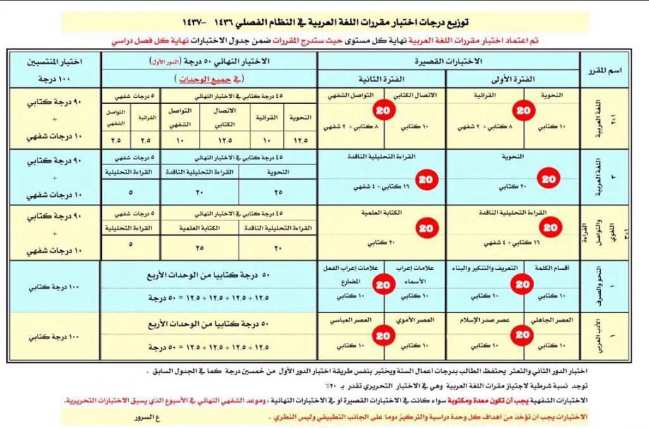 توزيع درجات اللغة العربية للنظام الفصلي الثانوي للأختبارات القصيرة و النهائية 2016م منتدى التعليم توزيع وتحضير المواد الدراسية